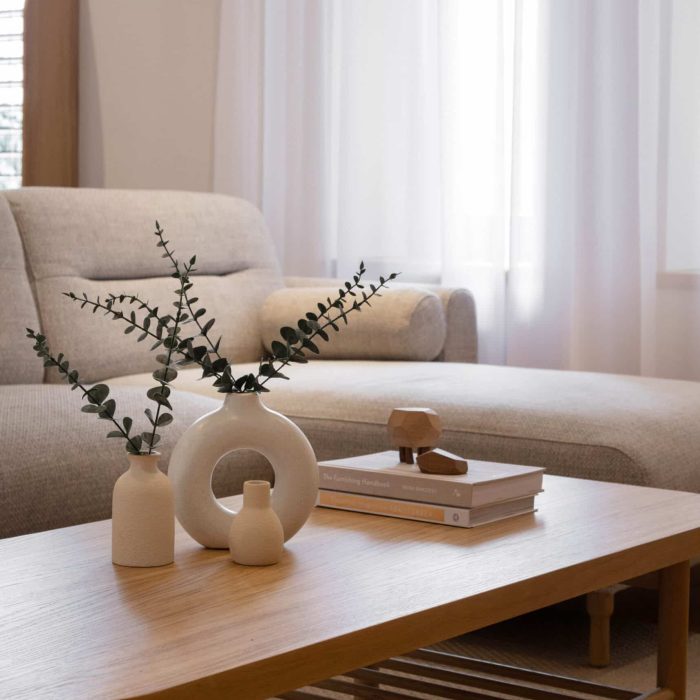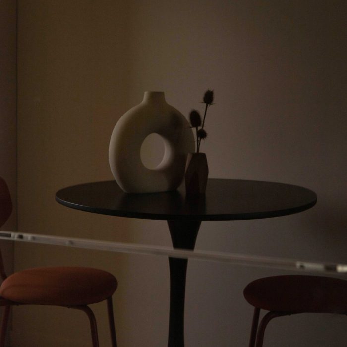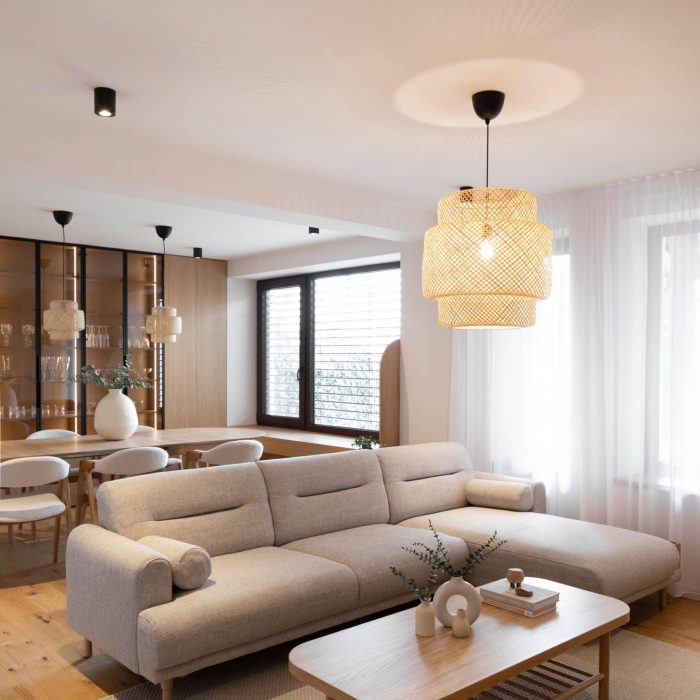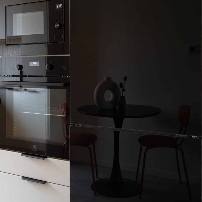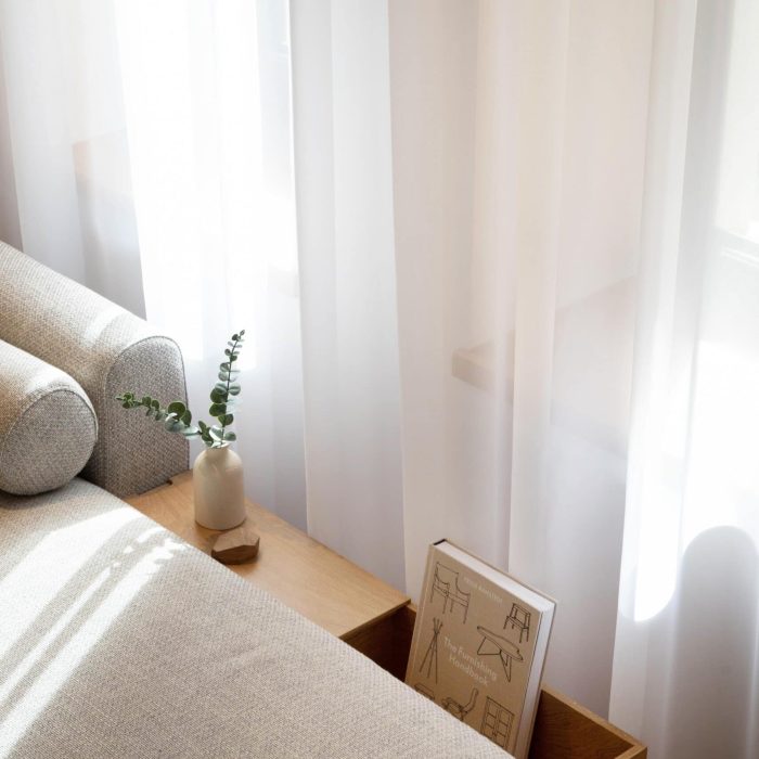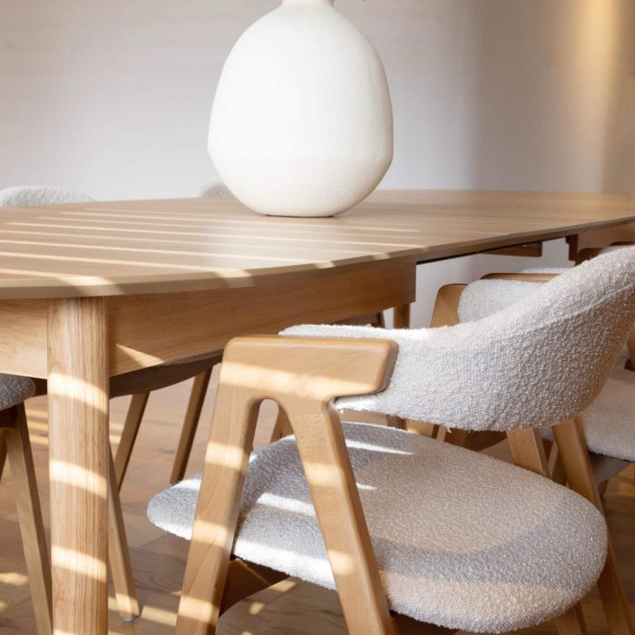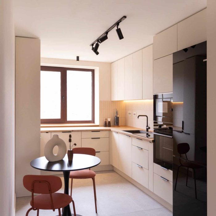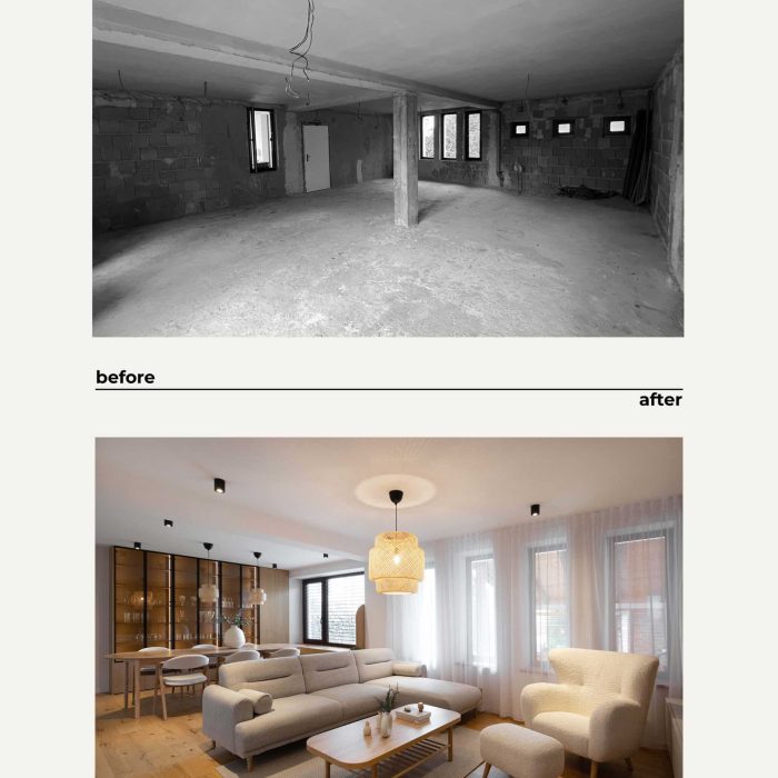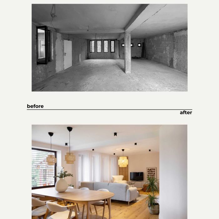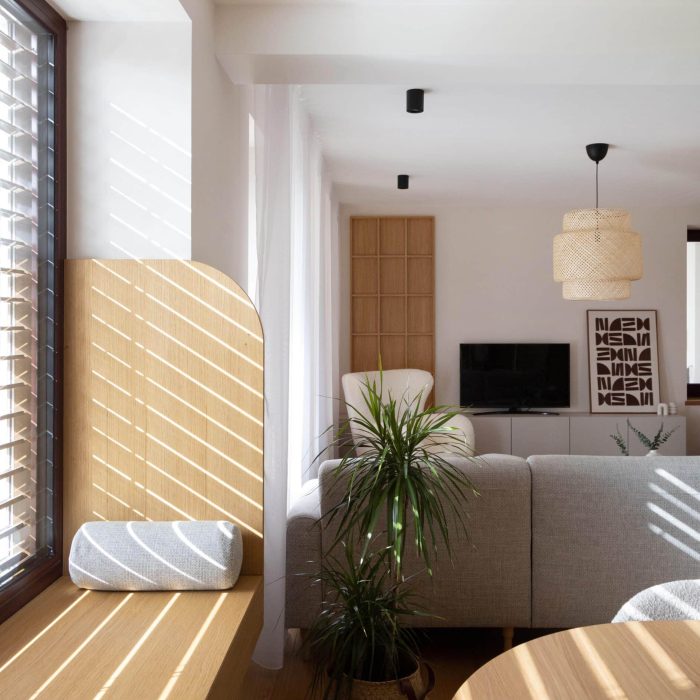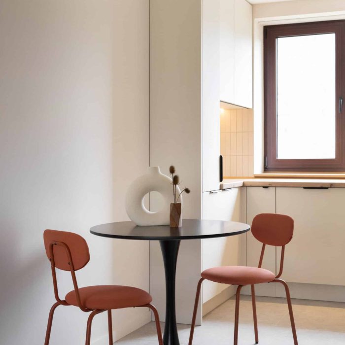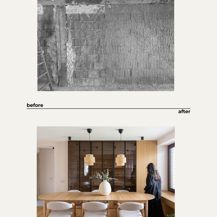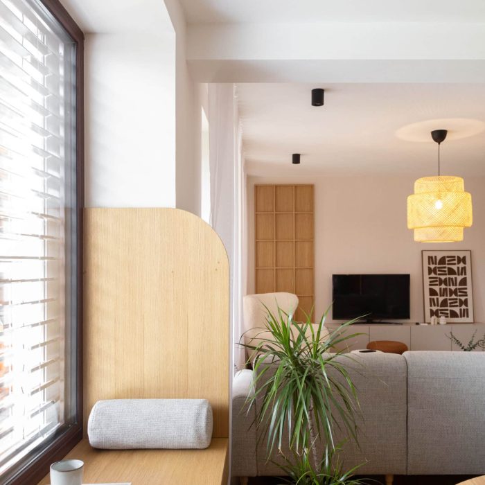 Am reconfigurat spatiul pentru a obtine o zona de living aerisita si un loc de luat masa suficient de incapator pentru intalniri ocazionale, fara a compromite sentimentul de calm si confort cotidian.