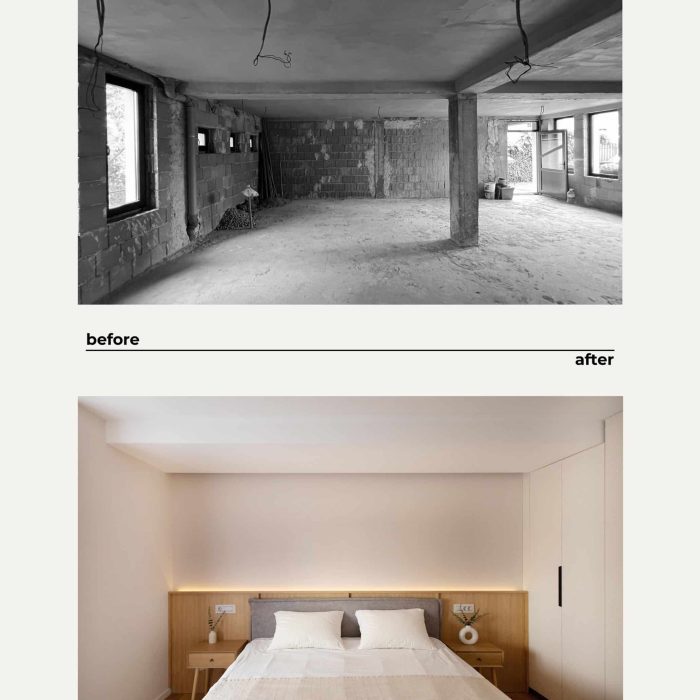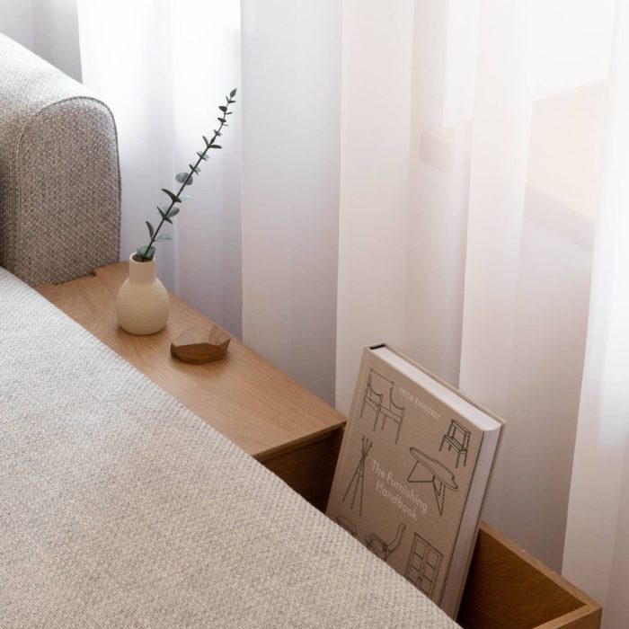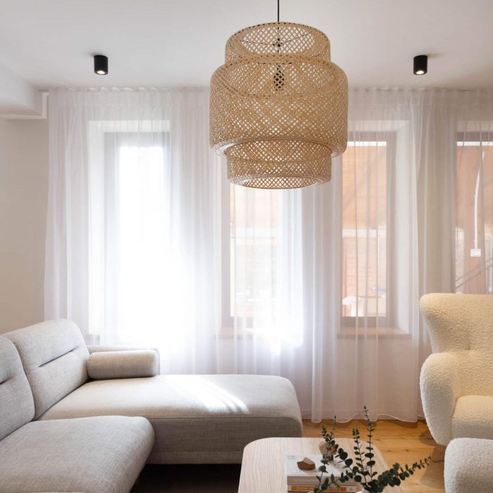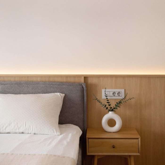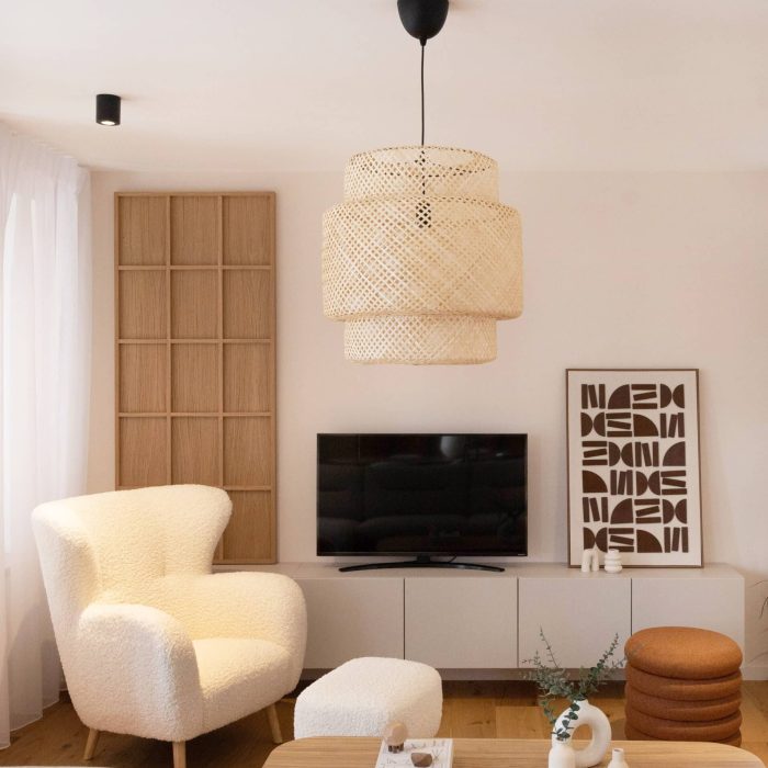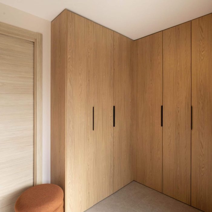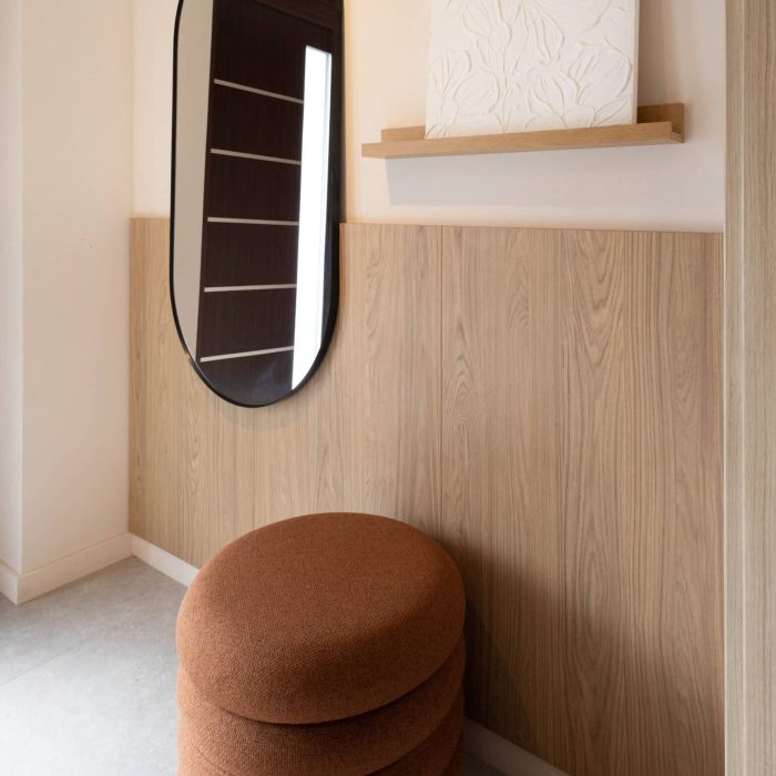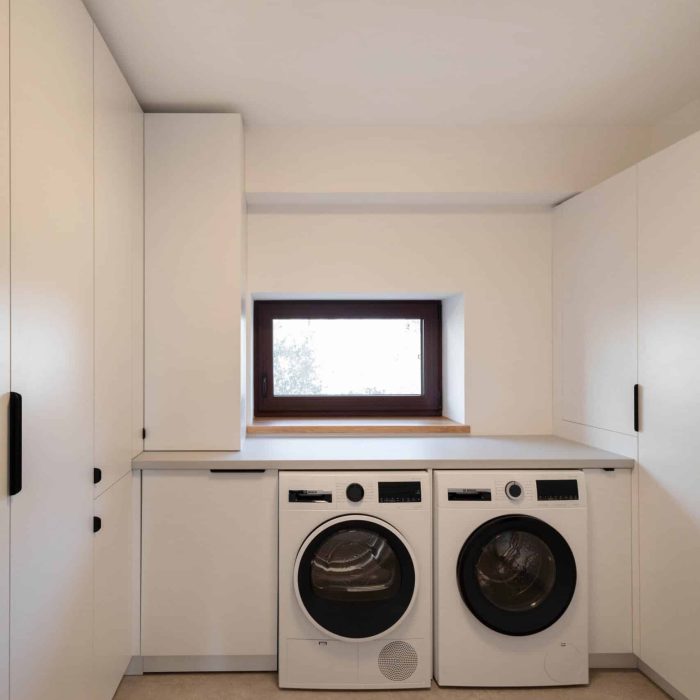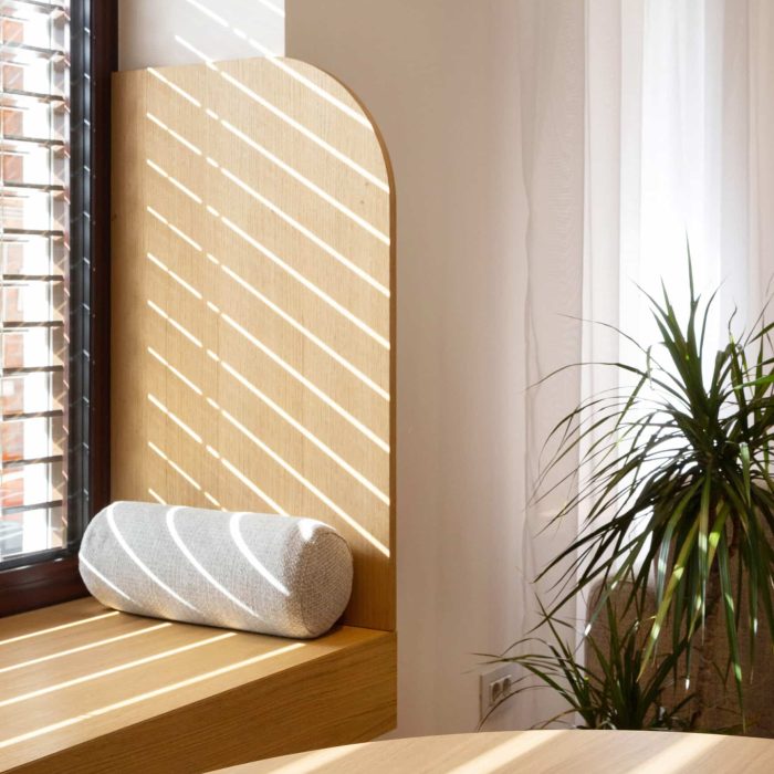Materialele si culorile au fost alese cu grija pentru a pastra o atmosfera calda si echilibrata: parchet din stejar, gresie bej, tonuri neutre si cateva accente de culoare discrete. Designul urmeaza principii de simplitate functionala si exprimare sincera a texturilor naturale.