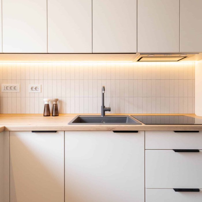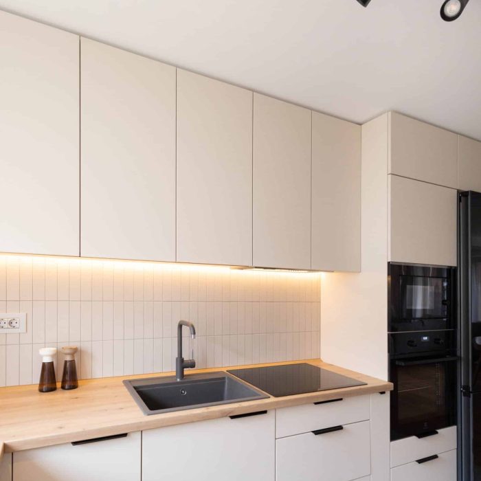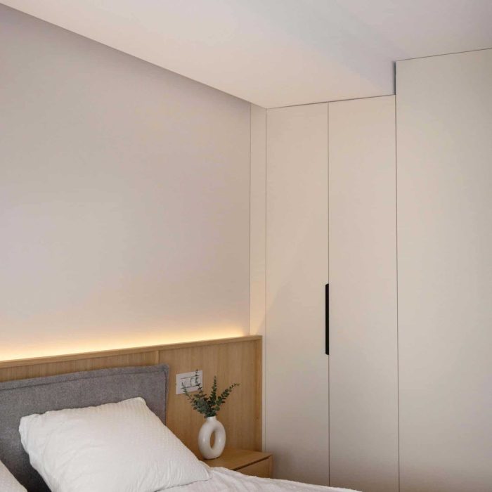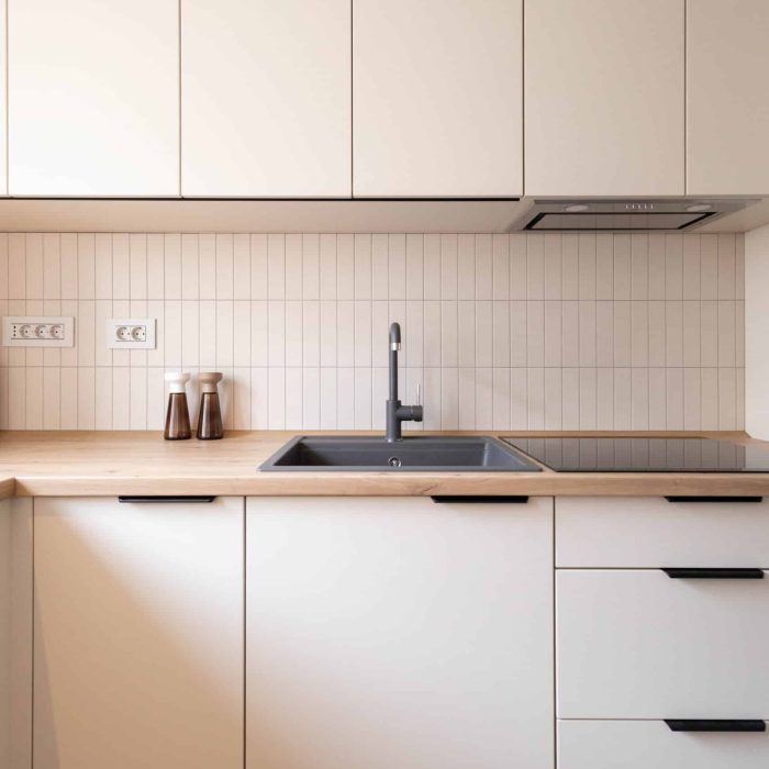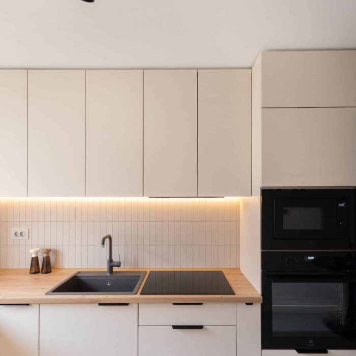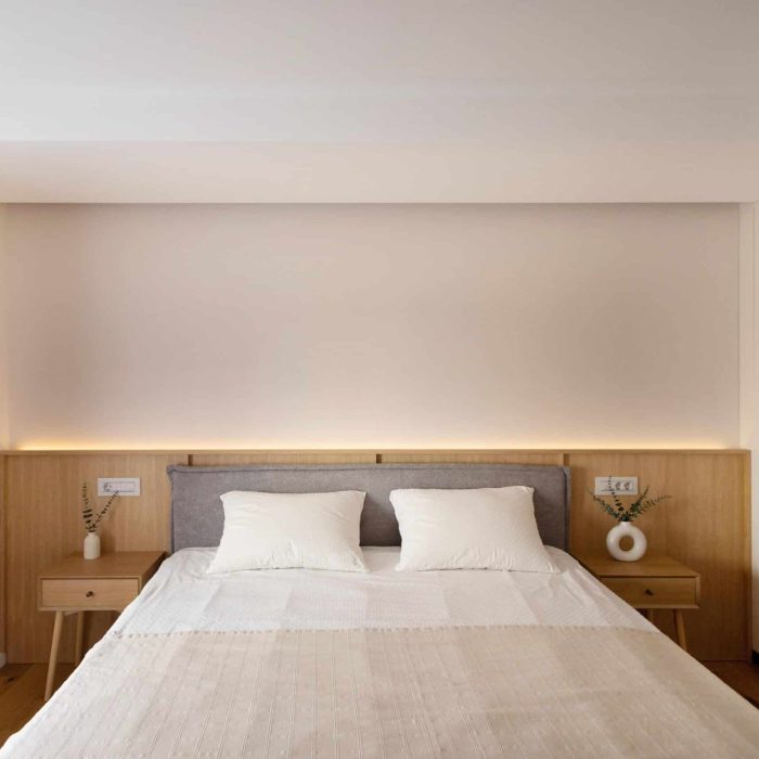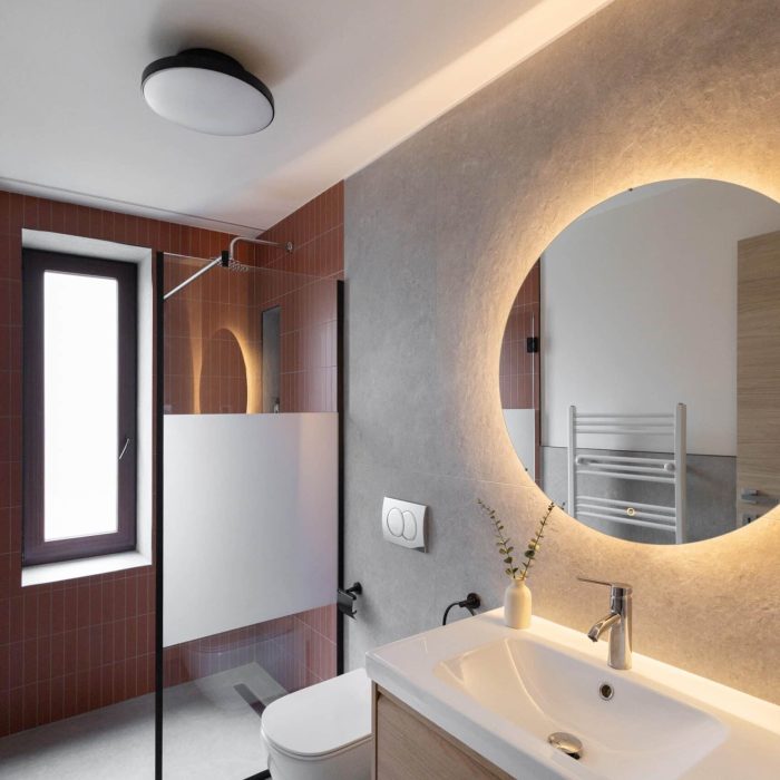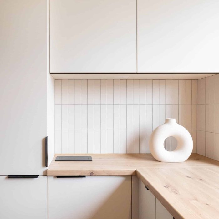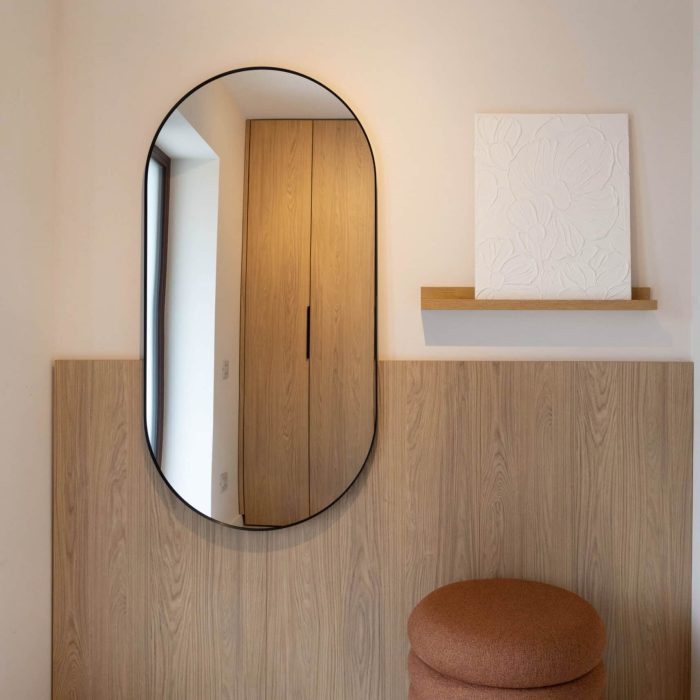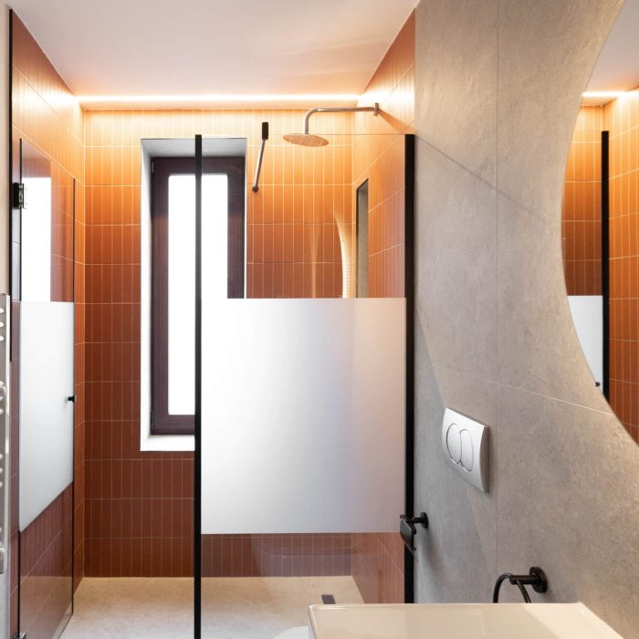 Materialele si culorile au fost alese cu grija pentru a pastra o atmosfera calda si echilibrata: parchet din stejar, gresie bej, tonuri neutre si cateva accente de culoare discrete. Designul urmeaza principii de simplitate functionala si exprimare sincera a texturilor naturale.