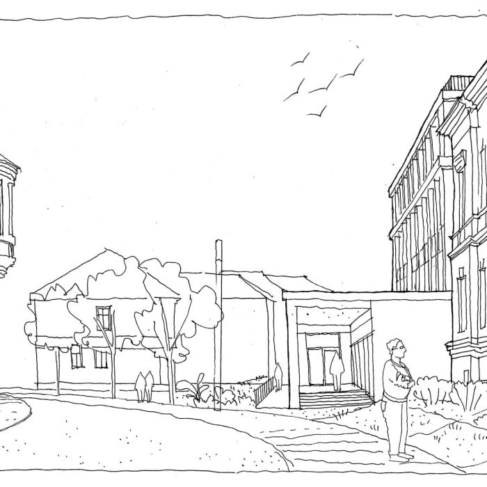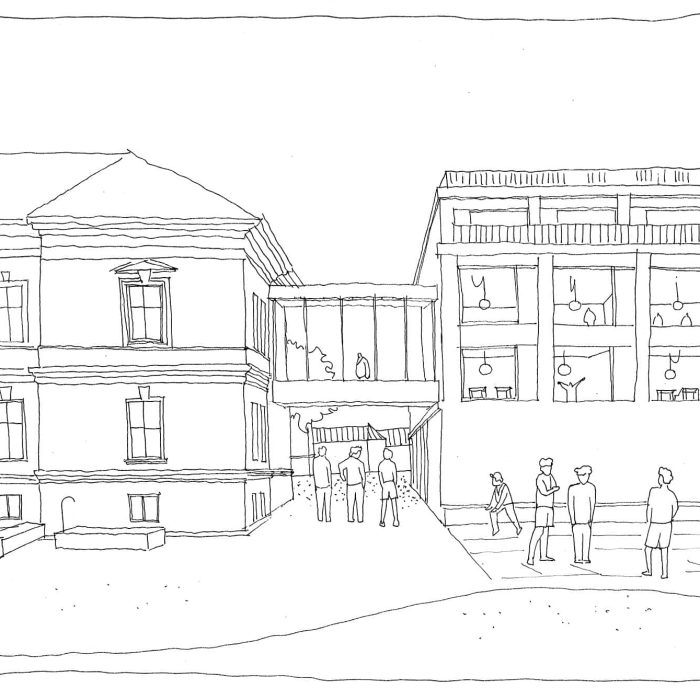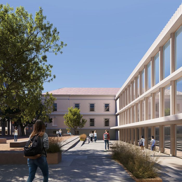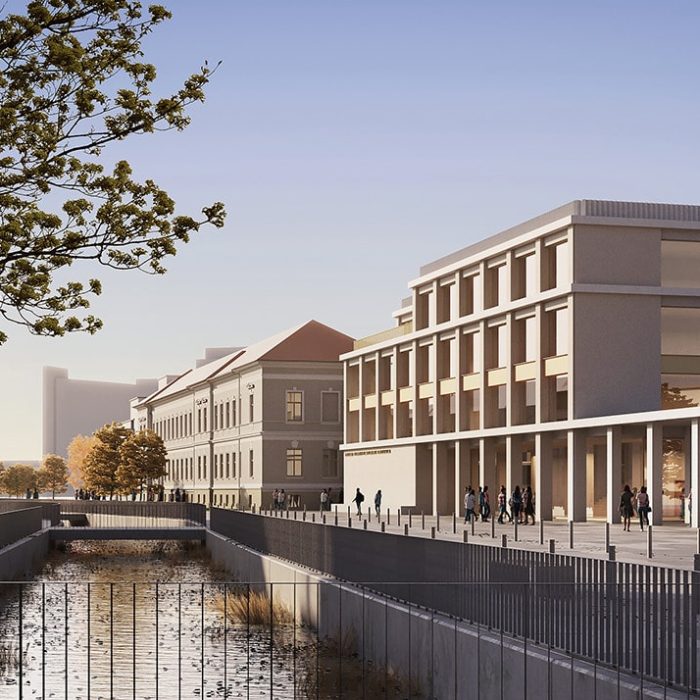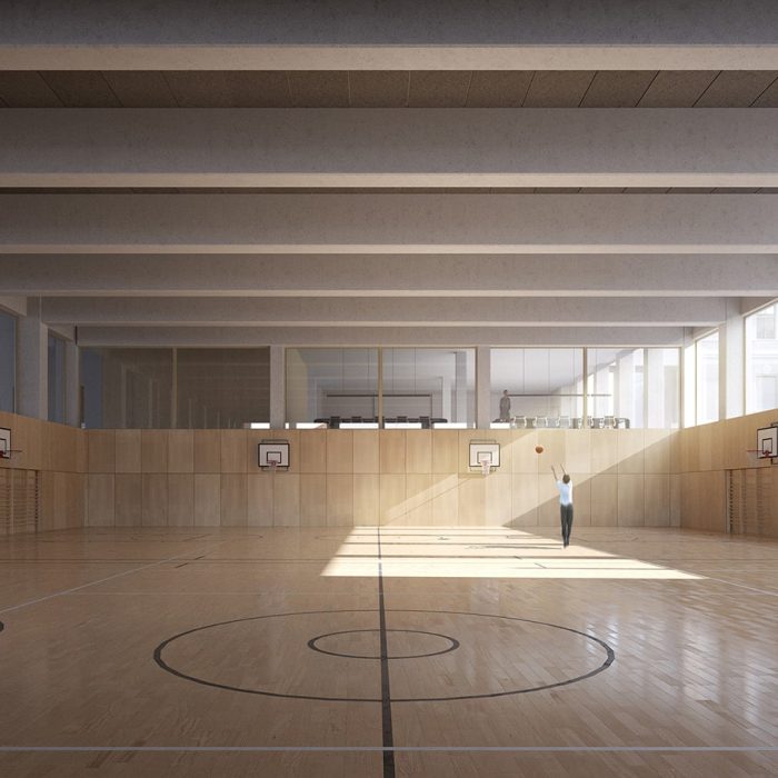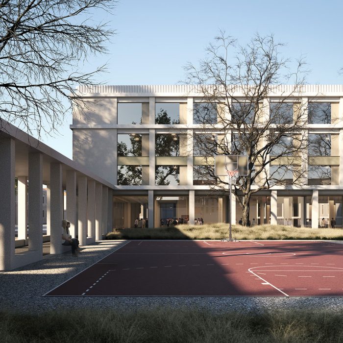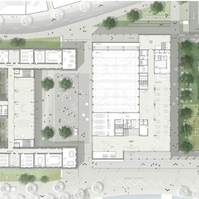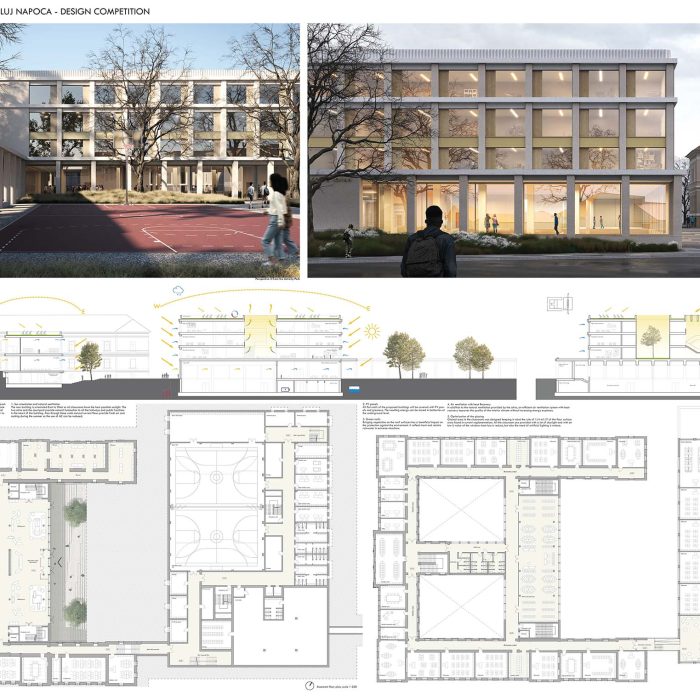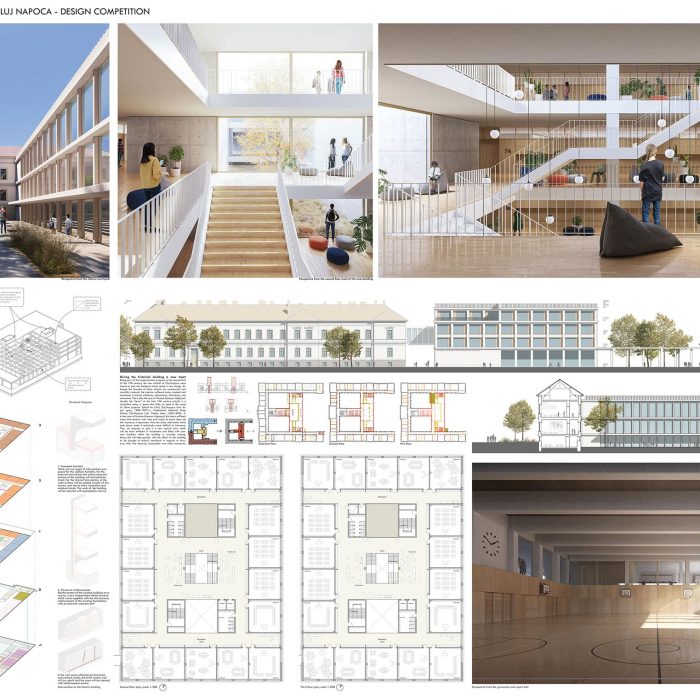“Proiectul propune o extindere sub forma unei clădiri unice, situată în proximitatea volumului existent și articulată cu acesta printr-o pasarelă cât și prin curtea de acces, care distribuie ambele corpuri ale liceului. În plus, echipa de proiect propune o reconfigurare a aripii centrale a clădirii, gândită pentru a optimiza accesul principal și distribuția către etaje. Terenurile de sport, situate în extremitatea nord-est a terenului, sunt integrate coerent în arhitectura ansamblului prin intermediul a doua porticuri. Acestea sunt generate la nivelul parterului de clădirea nouă și constituie o extindere naturală a tramei și materialității fațadei, care va acompania întreaga lungime a sitului. Propunerea include și posibilitatea utilizării terenurilor de sport de către public, în acest caz porticurile sunt folosite ca un filtru flexibil între spațiul privat și cel public.