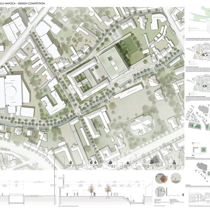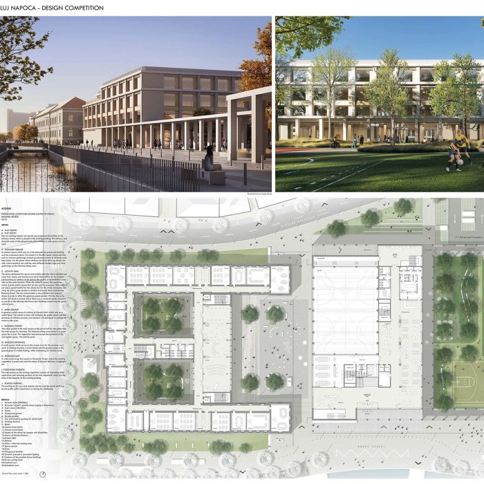 Propunerea noastră pentru concursul internațional de arhitectură pentru Liceul Nicolae Bălcescu din Cluj-Napoca a fost premiată cu locul al doilea. Ideea noastră a fost să creăm o școală care se deschide către public și devine parte a orașului. Pentru aceasta am creat o diversitate de spații publice care pot servi atât orașul, cât și școala. Mai mult, am propus ca curtea principală a școlii, împreună cu terenurile de sport pe care le-am numit Parcul de Activități, să rămână deschise și după orele școlare și în weekend-uri. Porticul servește scopului de a crea spații intermediare interesante care oferă adăpost de ploaie și soare, dar și un limită între spațiul public și privat, astfel încât ideea și percepția “gardului școlii” să fie diminuate. În plus, funcțiile de la parterul clădirii noi sunt flexibile, astfel încât să poată adapta diferite tipuri de activități în timpul și după orele școlare.