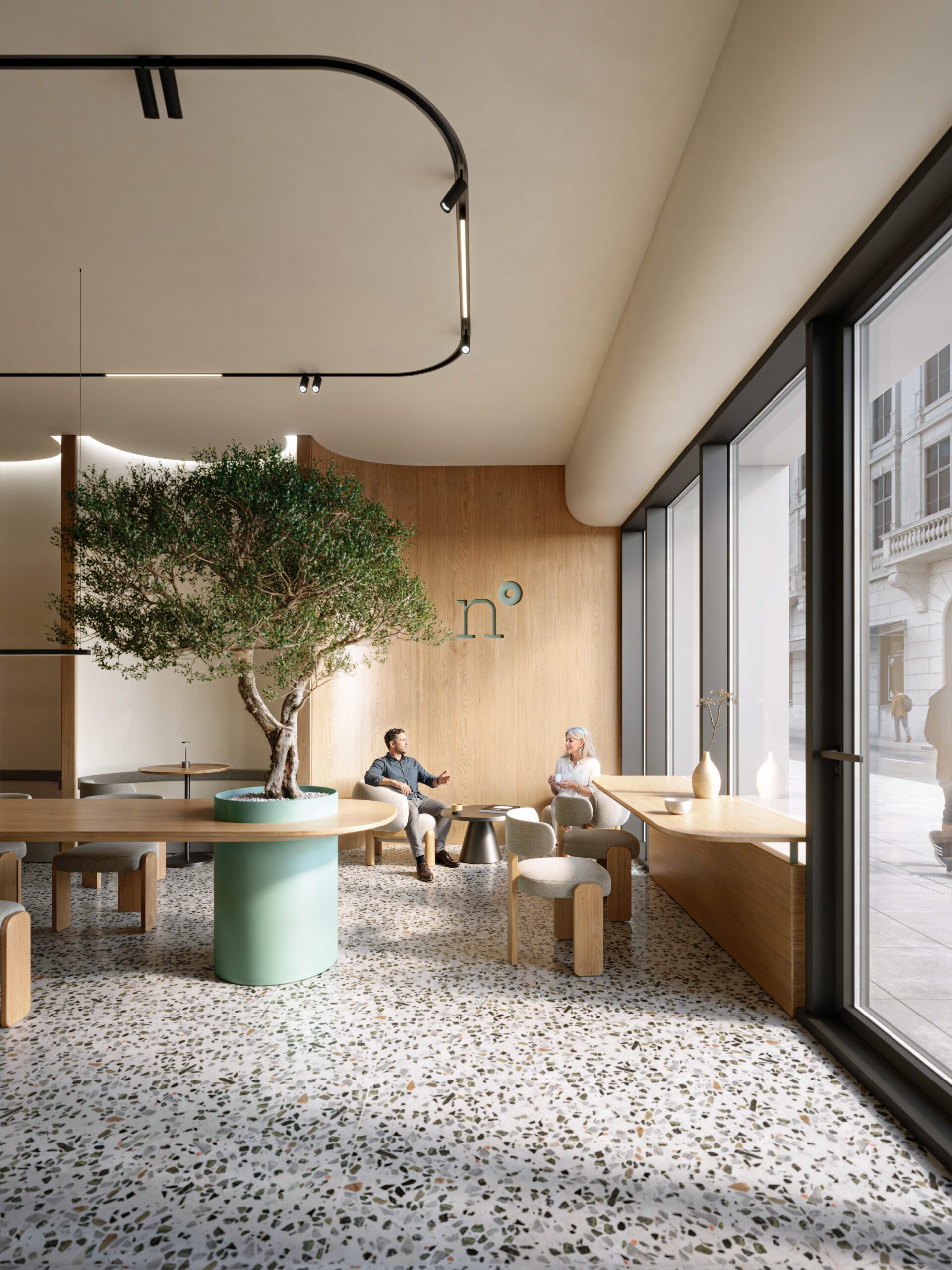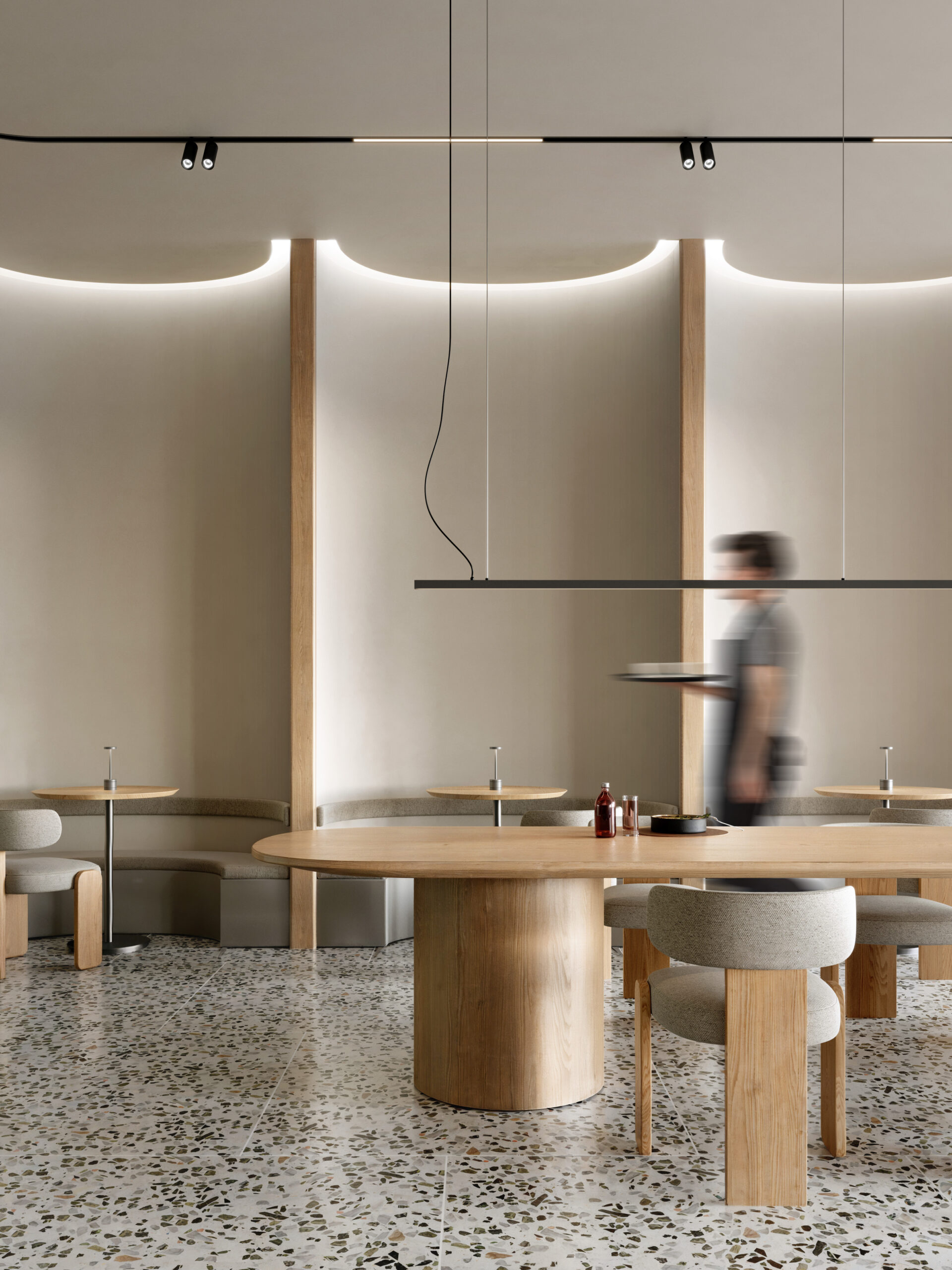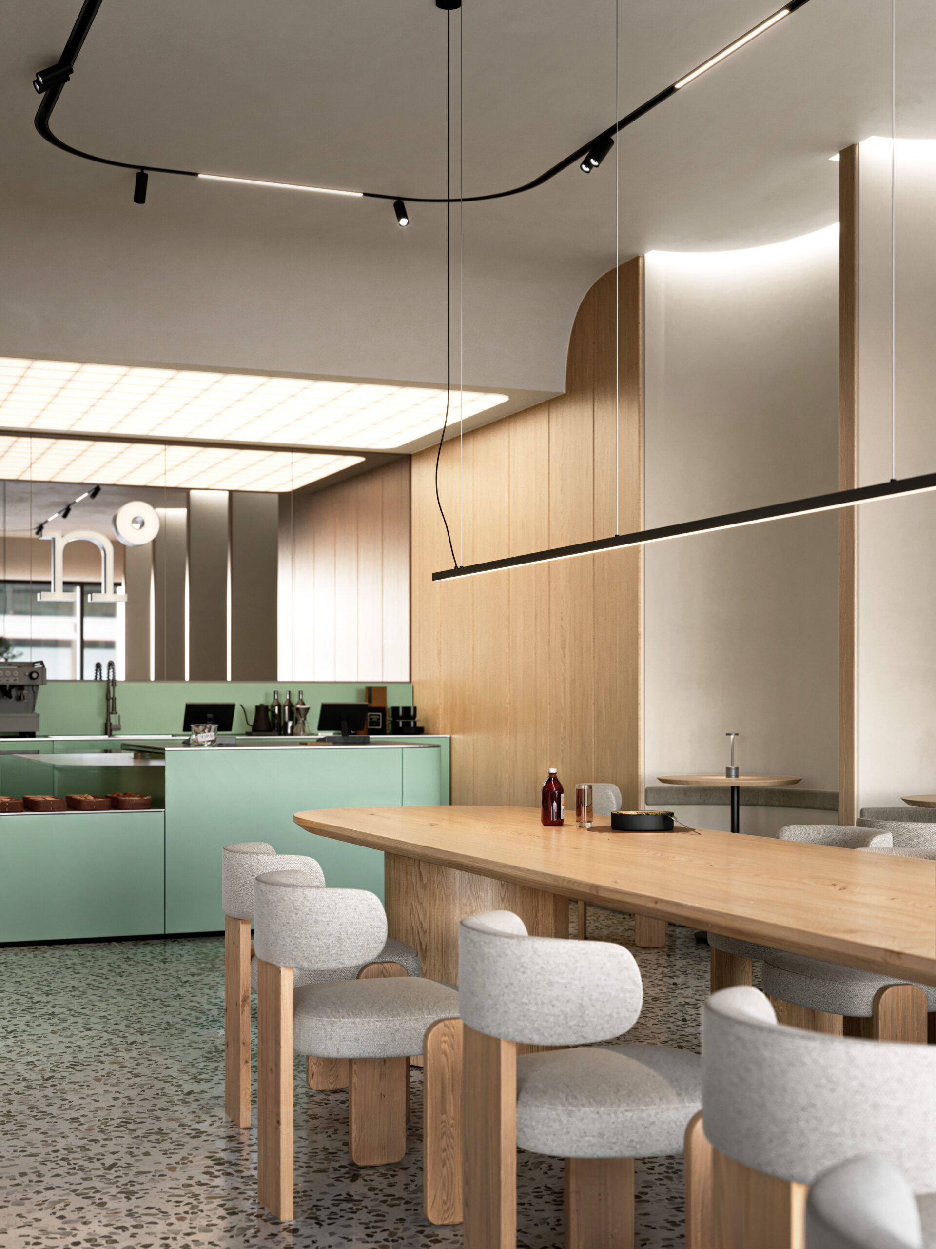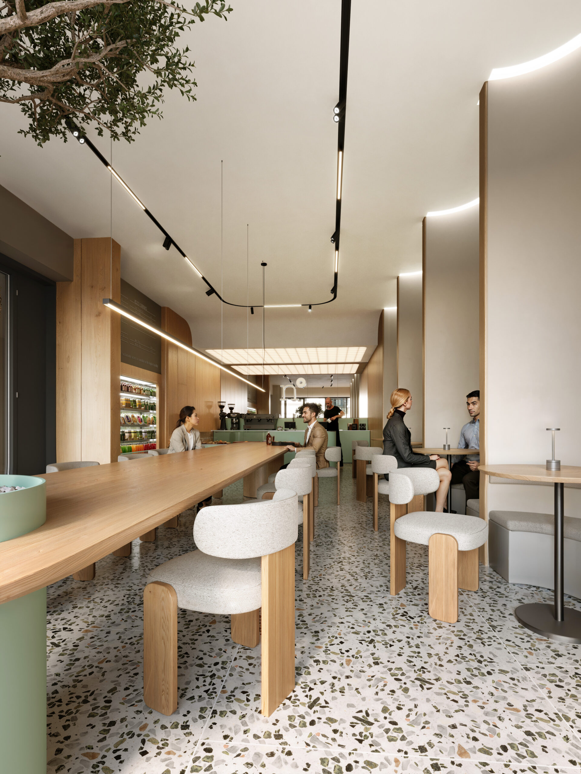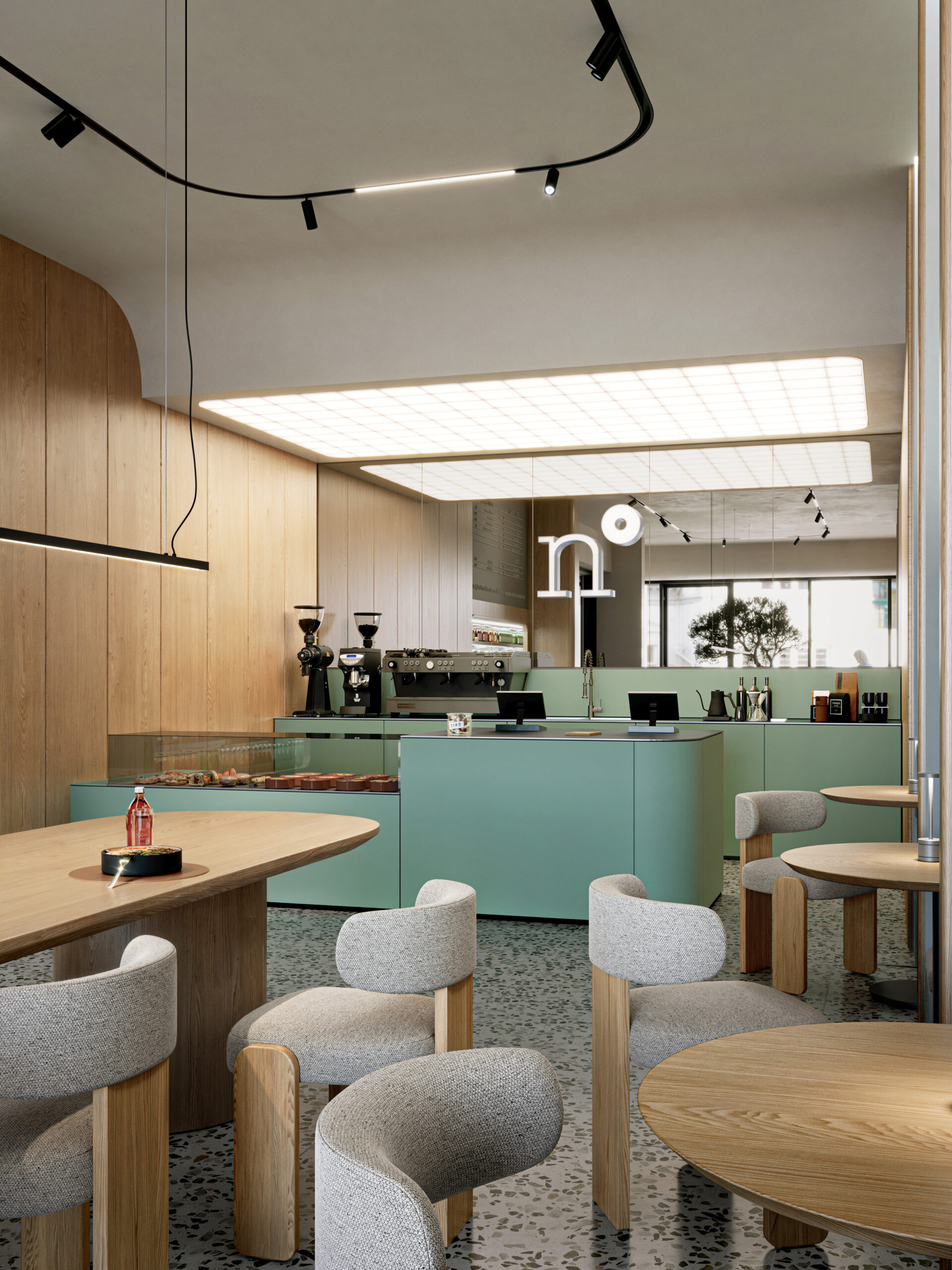 Nutriento Health Food Restaurant este un spațiu gândit în jurul ideii de prospețime și natural. Am folosit terrazzo și MDF în culoarea brandului combinate cu mobilier din stejar și pereți în tonuri de bej, pentru o atmosferă caldă și deschisă.