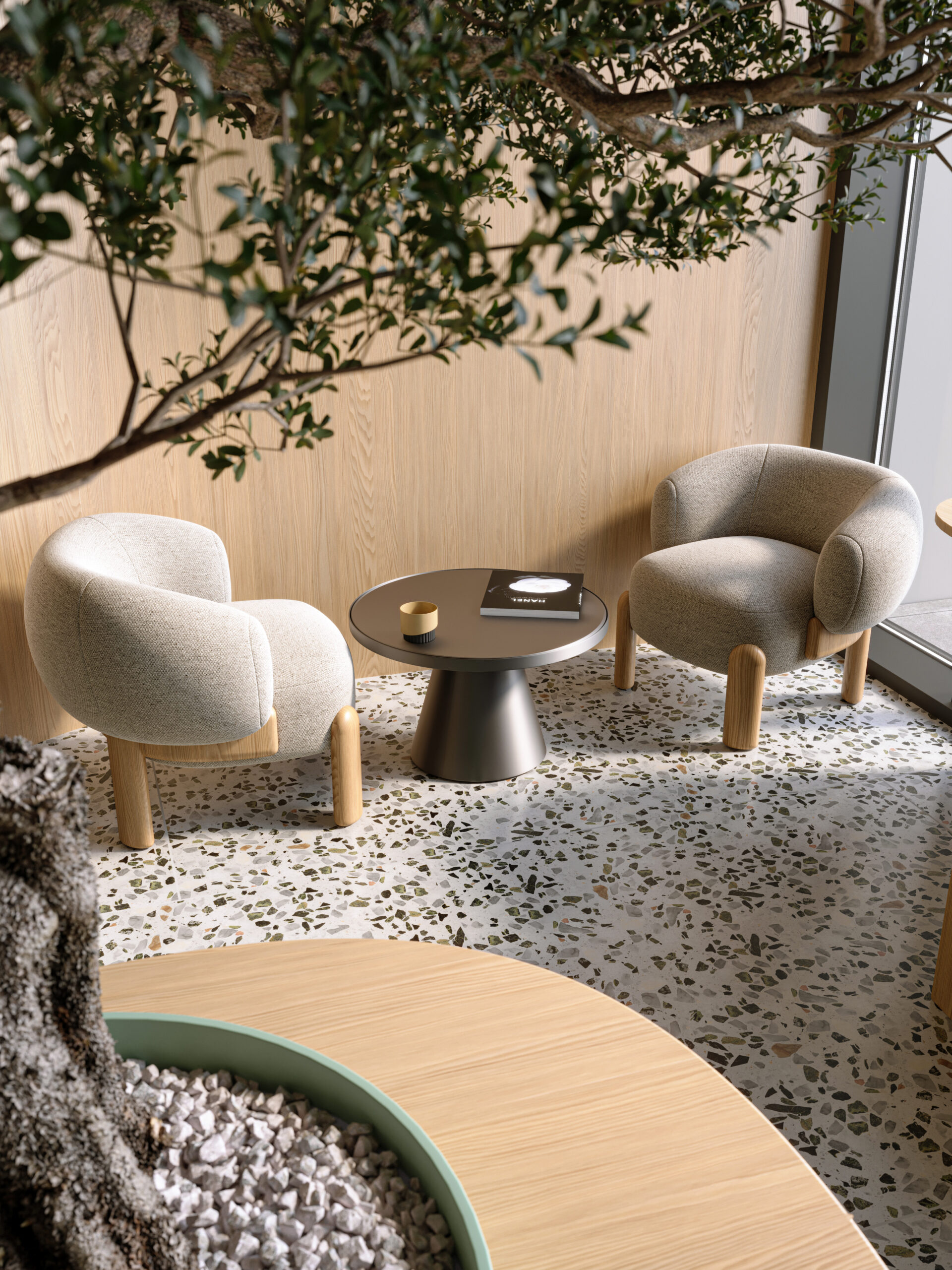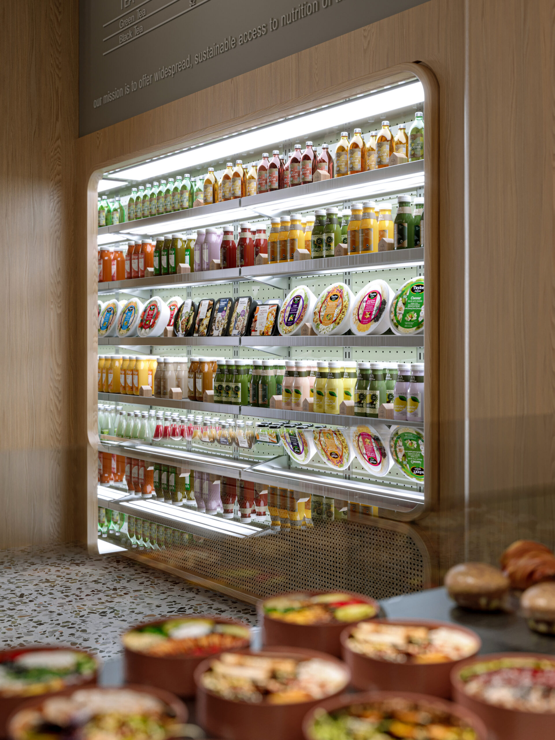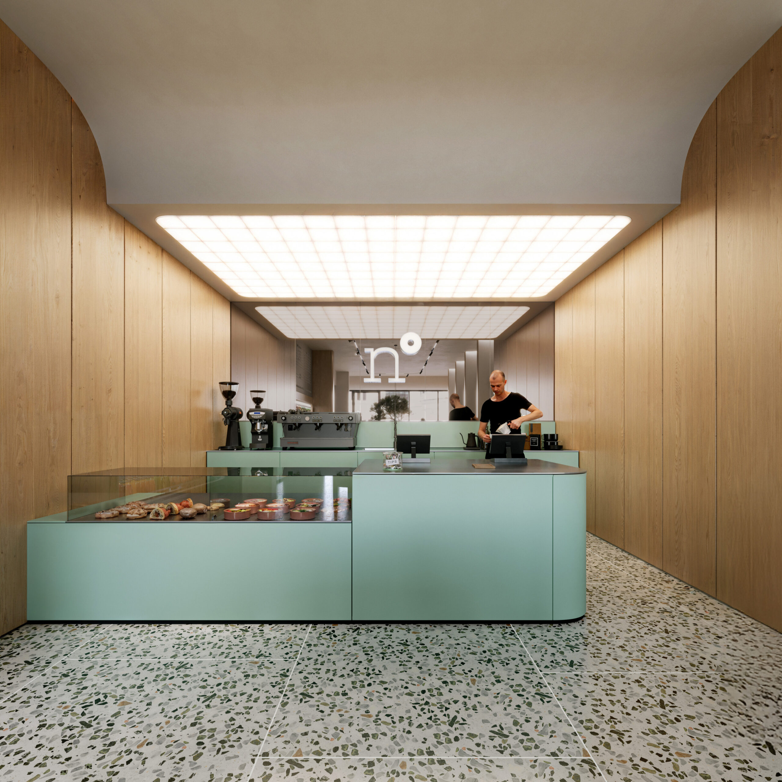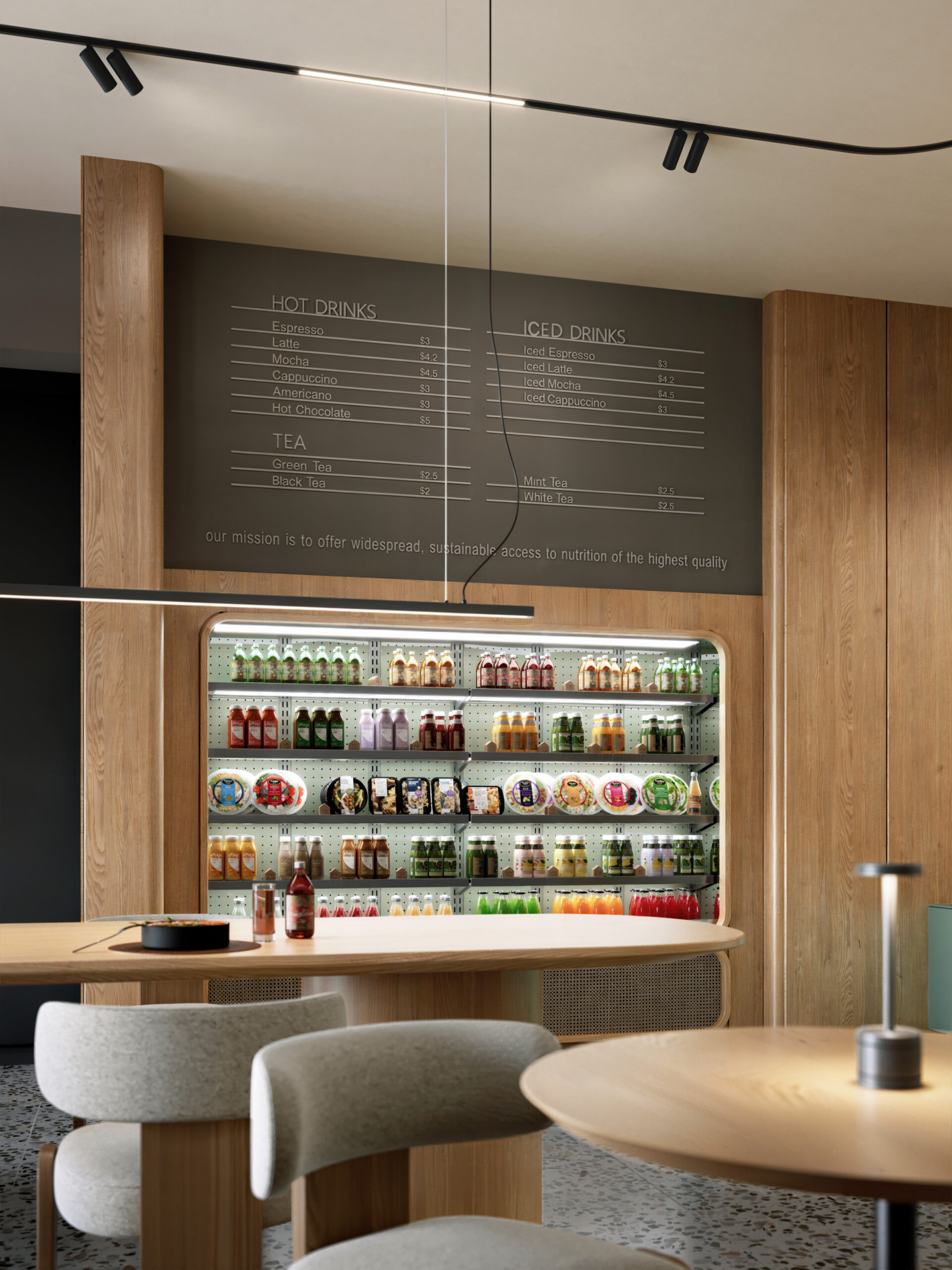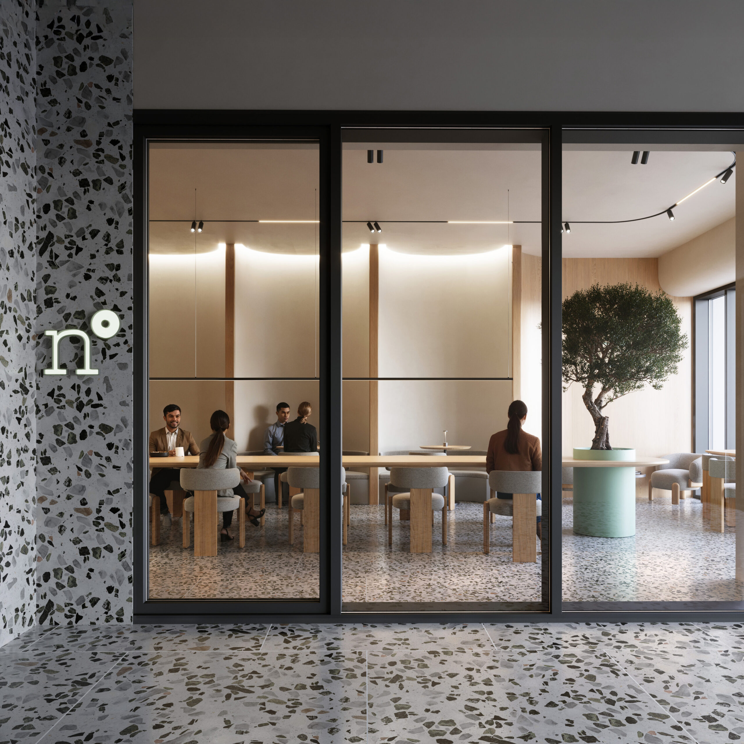 Nutriento Health Food Restaurant este un spațiu gândit în jurul ideii de prospețime și natural. Am folosit terrazzo și MDF în culoarea brandului combinate cu mobilier din stejar și pereți în tonuri de bej, pentru o atmosferă caldă și deschisă.