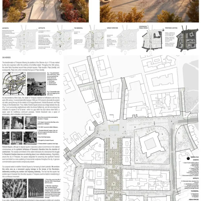 Propunerea noastră își propune să redefinească Piața Victoriei valorificându-i potențialul latent. Ne imaginăm întreaga zonă ca un monument aducând omagiu eroilor Revoluției, evitând în mod deliberat solemnitatea sumbră și impunătoare. Faptul că această piață are un alt tip de caracter față de celelalte piețe din Timișoara ar putea fi util în transformarea sa într-un monument continuu.